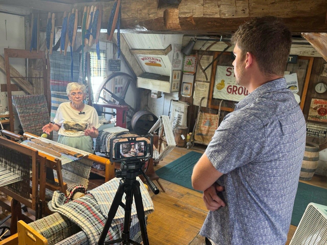 Griffin Machrowicz speaks with Grace Geisler on her use of an 1890s loom to create rag rugs. (Photo by Peter Grobbel)