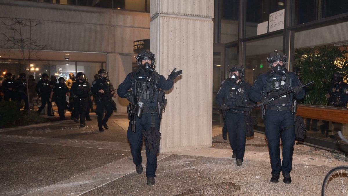 Officers from the Eugene and Springfield Mobile Response Teams line up outside the Eugene Federal Building in Oregon. (Saj Sundaram // The Daily Emerald)