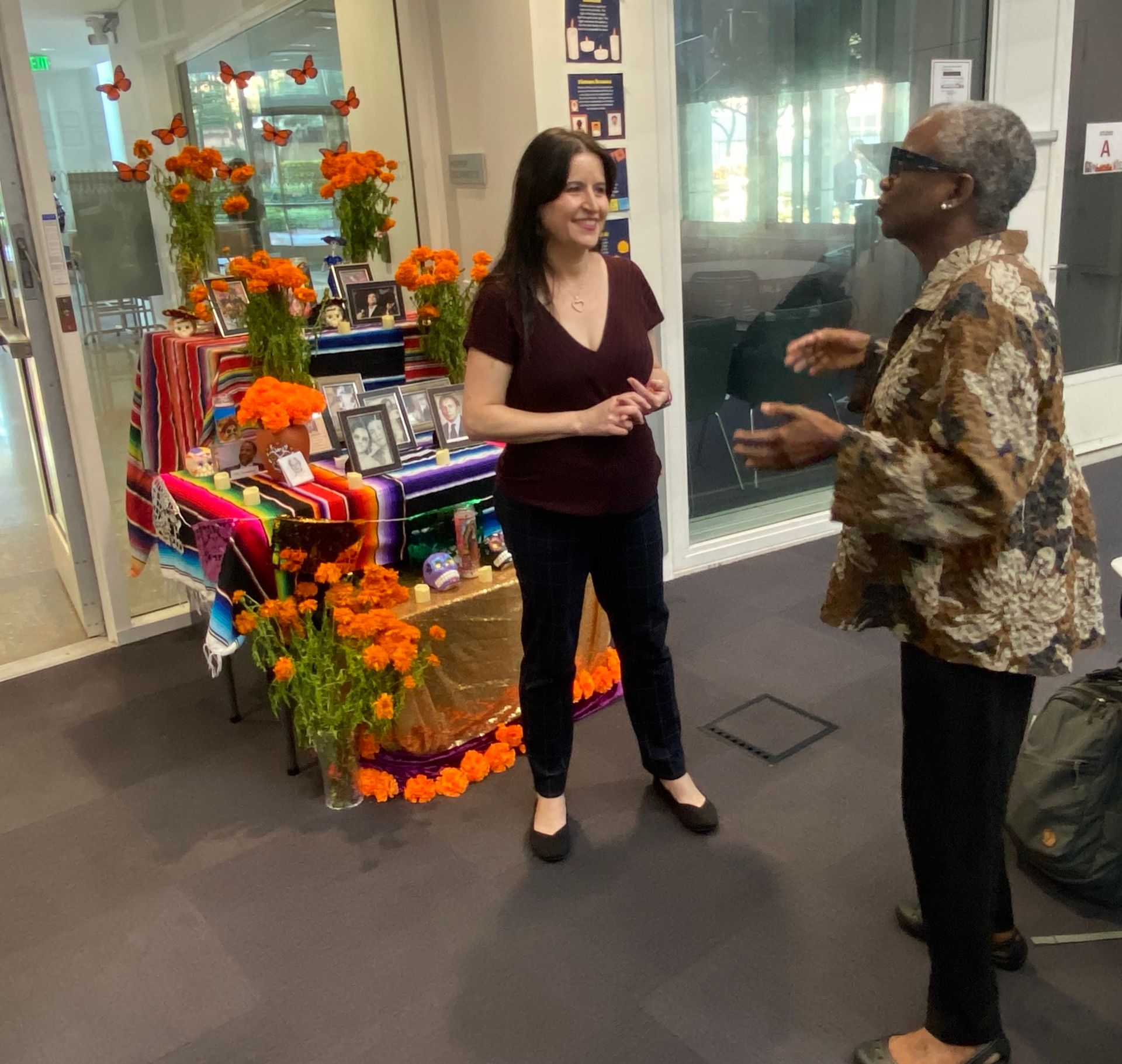 Christina Bellatoni, center, talks with Dr. Kathleen McElroy inside the USC Annenberg Media Center, where students have celebrated Dia de los Muertos for several years.